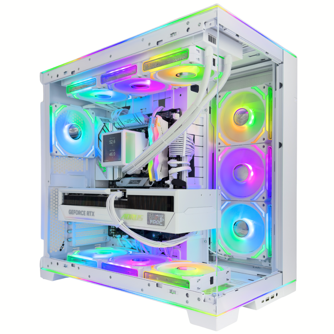Case: White LIAN LI 011 Dynamic EVO RGB with 4-120mm White AsiaHorse Cosmiq Infinity Style A-RGB Fans + 6-120mm White AsiaHorse Coamiq Infinity A-RGB Fans all controllable to a variety of colors and effects with preinstalled motherboard software