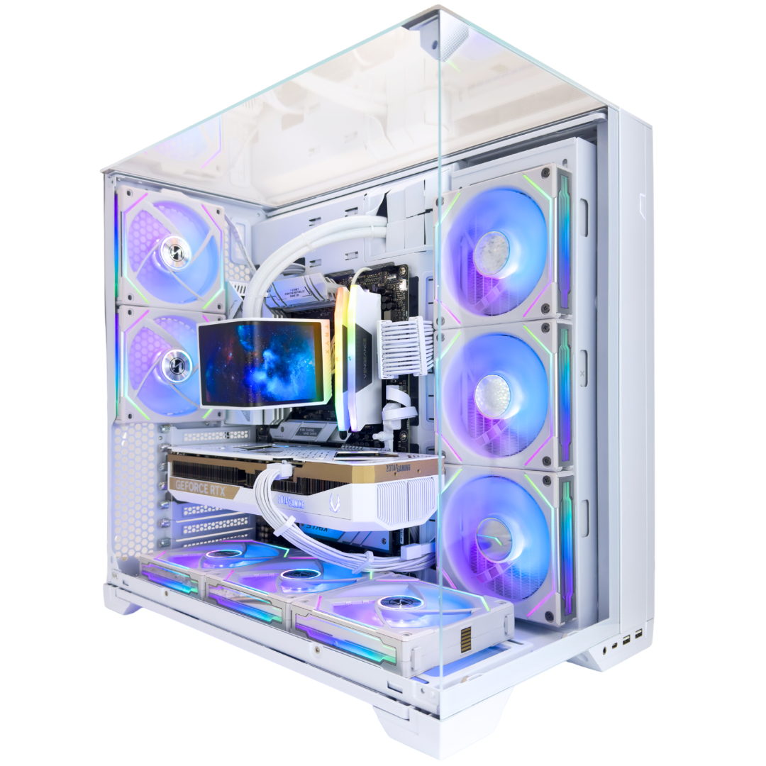 Case: White Lian Li 011 Vision Compact Case with 8-120mm White LIAN LI UNI FAN SL-INF A-RGB Fans all controllable to a variety of colors and effects with preinstalled motherboard software