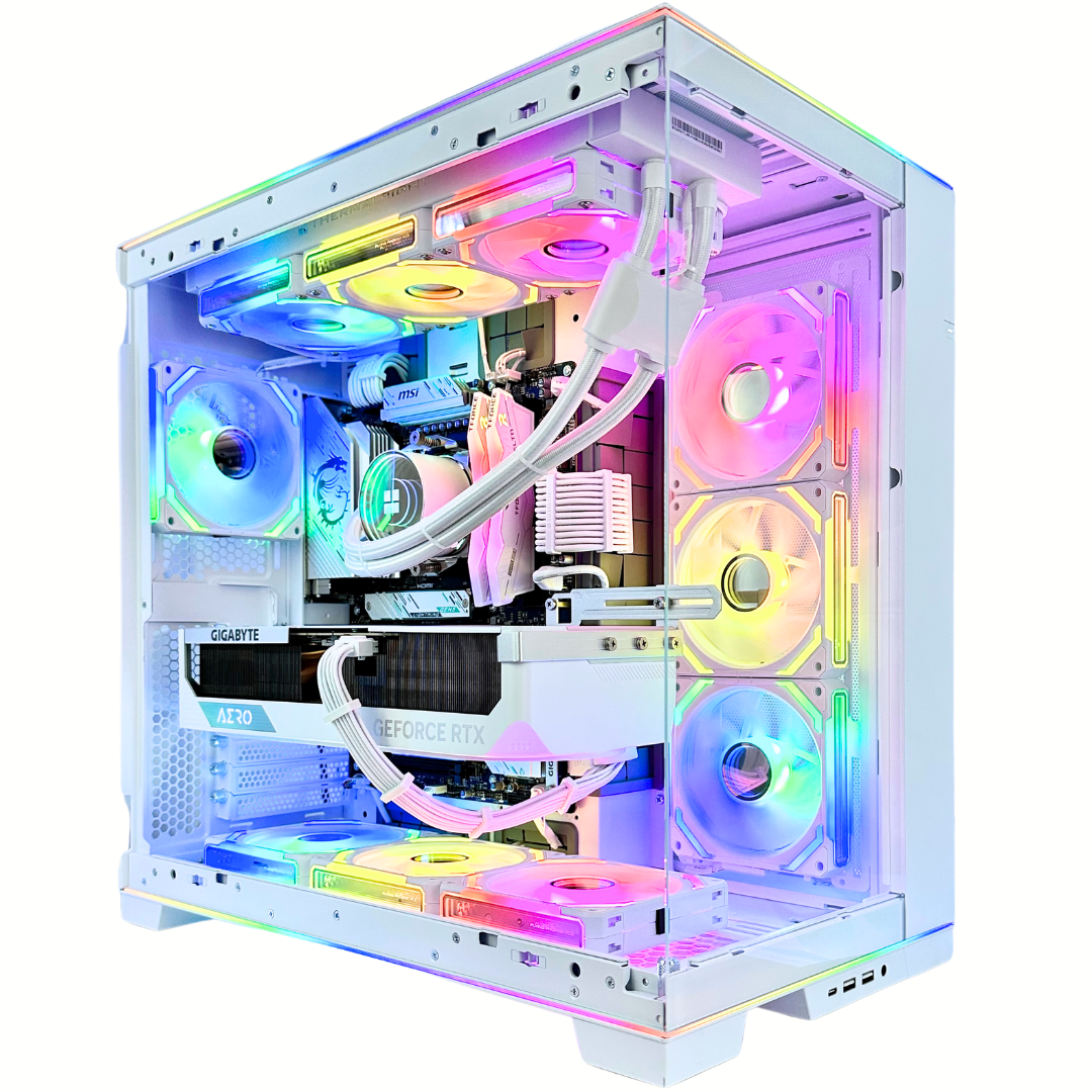 Case: White LIAN LI 011 Dynamic EVO RGB with 4-120mm White AsiaHorse Cosmiq Infinity Style A-RGB Fans + 6-120mm White Reverse AsiaHorse Cosmiq Infinity Style A-RGB Fans all controllable to a variety of colors and effects with preinstalled motherboard software